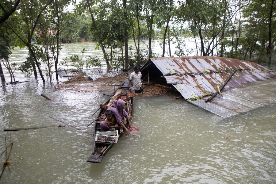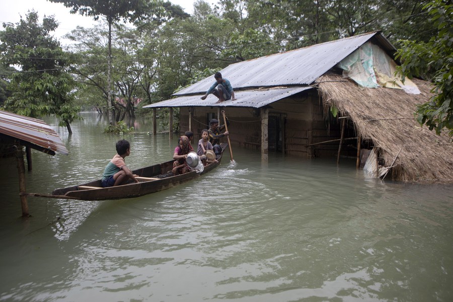 People prepare to move by boat from a flood-affected area to a safe place in Sylhet, Bangladesh, on June 19, 2022. (Xinhua)