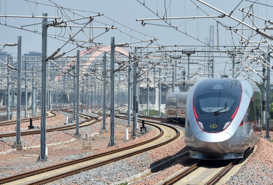 Train No. G601 departs from Beijing Fengtai Railway Station in Beijing, capital of China, June 20, 2022. The largest passenger railway hub in Asia was put into operation Monday in Beijing as a four-year reconstruction breathes new life into the Chinese capital's oldest railway station. With a gross floor area of nearly 400,000 square meters, or 56 standard football pitches, Beijing Fengtai Railway Station has 32 rail tracks and 32 platforms and is able to accommodate a maximum of 14,000 passengers per hour. (Xinhua/Zhang Chenlin)