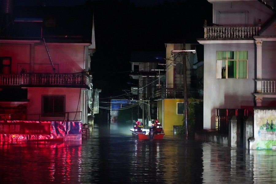 Rescuers enter a village to evacuate people stranded by floods in Dexing, east China's Jiangxi Province, June 20, 2022.