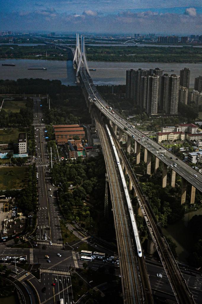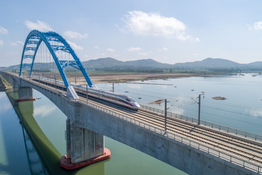 Aerial photo shows a high-speed train running on the Beijing-Wuhan section of the Beijing-Guangzhou High-speed Railway in Wuhan, central China's Hubei Province, June 20, 2022. A high-speed rail linking Beijing with Wuhan, the capital of central China's Hubei Province, starts normal operation at a speed of 350 km/h on Monday, said the China State Railway Group Co., Ltd. With train speed raised from 310 km/h to 350 km/h, the overall transportation capacity of the section is expected to increase by 7 percent, and the shortest trip between Beijing and Wuhan has been reduced to three hours and 48 minutes, according to the company. (Xinhua/Xiao Yijiu)