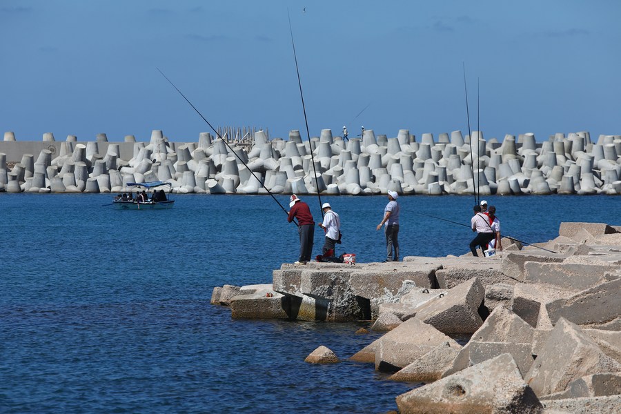 Anglers stand on concrete barriers against sea-level rises in Alexandria, Egypt, June 19, 2022.
