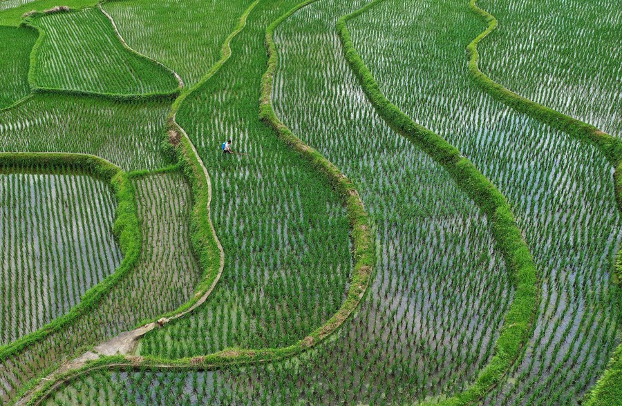 Aerial photo taken on June 20, 2022 shows a farmer working in paddy fields in Migao Village of Danzhai County, Qiandongnan Miao and Dong Autonomous Prefecture, southwest China's Guizhou Province. (Photo by Huang Xiaohai/Xinhua)