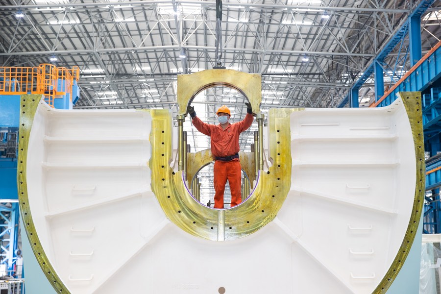 A staff member is on duty at a workshop of CSSC-MES Diesel Co., Ltd. in east China's Shanghai, June 14, 2022. (Xinhua/Jin Liwang)