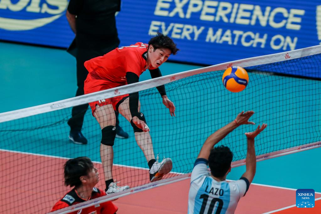 Japan's Ishikawa Yuki (L) spikes the ball during the FIVB Volleyball Nations League Men's Pool 3 match between Japan and Argentina in Quezon City, the Philippines on June 21, 2022. (Xinhua/Rouelle Umali)