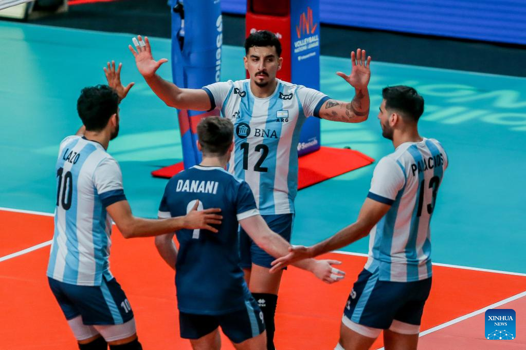 Players of Argentina celebrate after scoring during the FIVB Volleyball Nations League Men's Pool 3 match between Japan and Argentina in Quezon City, the Philippines on June 21, 2022. (Xinhua/Rouelle Umali)