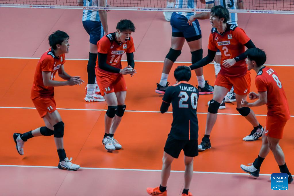 Players of Japan celebrate after scoring during the FIVB Volleyball Nations League Men's Pool 3 match between Japan and Argentina in Quezon City, the Philippines on June 21, 2022. (Xinhua/Rouelle Umali)