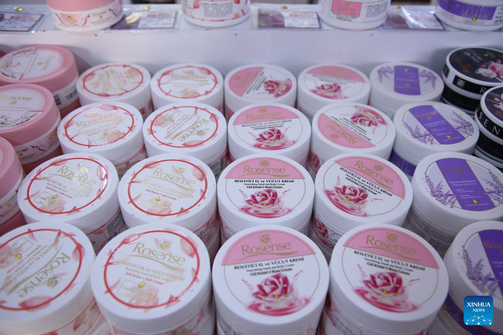 Rose products are displayed in a shop in Isparta, a southern province known as the "land of roses", in Turkey, on June 15, 2022. (Xinhua/Li Zhenbei)
