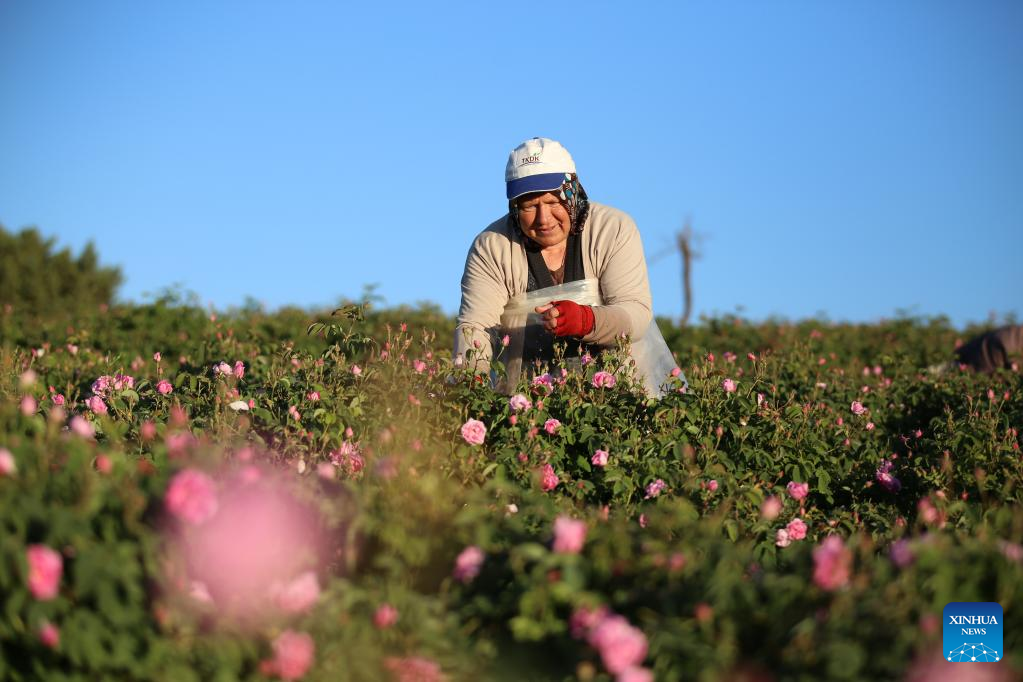 A flower farmer picks roses in a rose garden in Isparta, a southern province known as the "land of roses", in Turkey, on June 15, 2022. (Xinhua/Li Zhenbei)