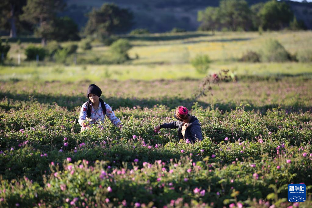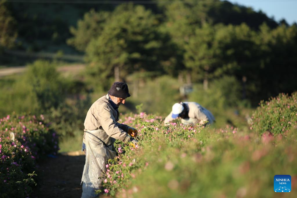 Flower farmers pick roses in a rose garden in Isparta, a southern province known as the "land of roses", in Turkey, on June 15, 2022. (Xinhua/Li Zhenbei)