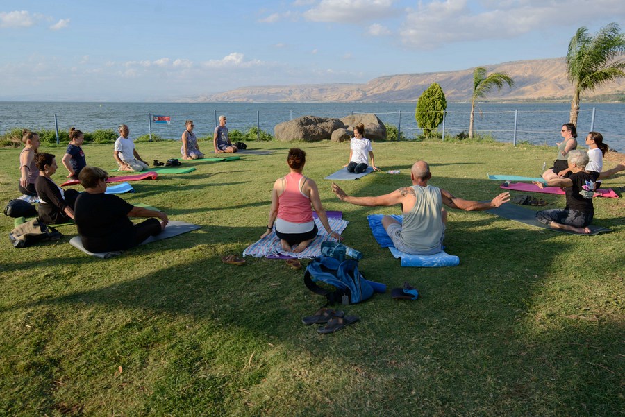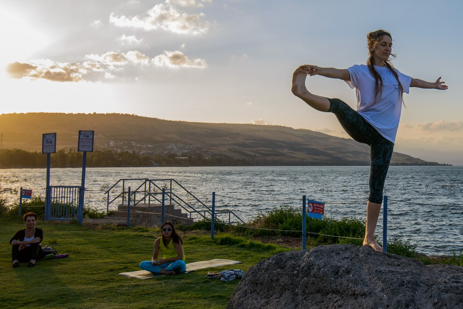 Israeli Yogis practice yoga on the International Day of Yoga next to the Sea of Galilee, Israel, on June 21, 2022. (Ayal Margolin/JINI via Xinhua)■