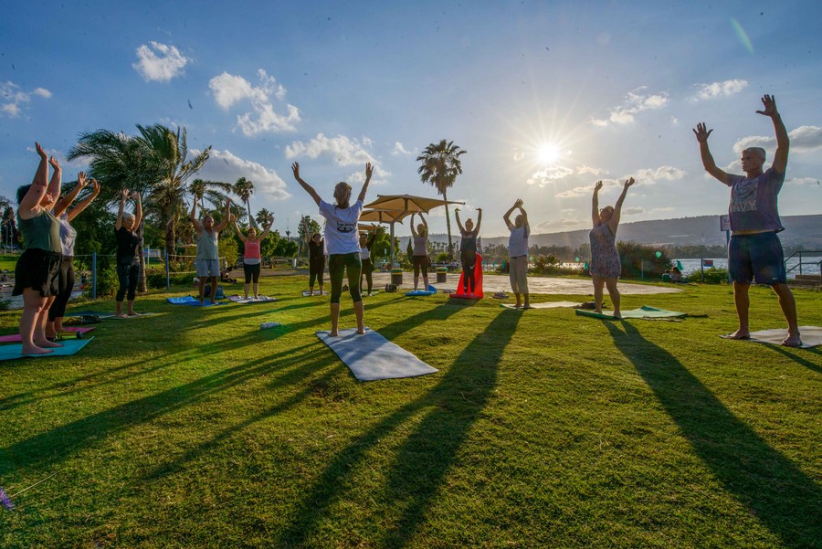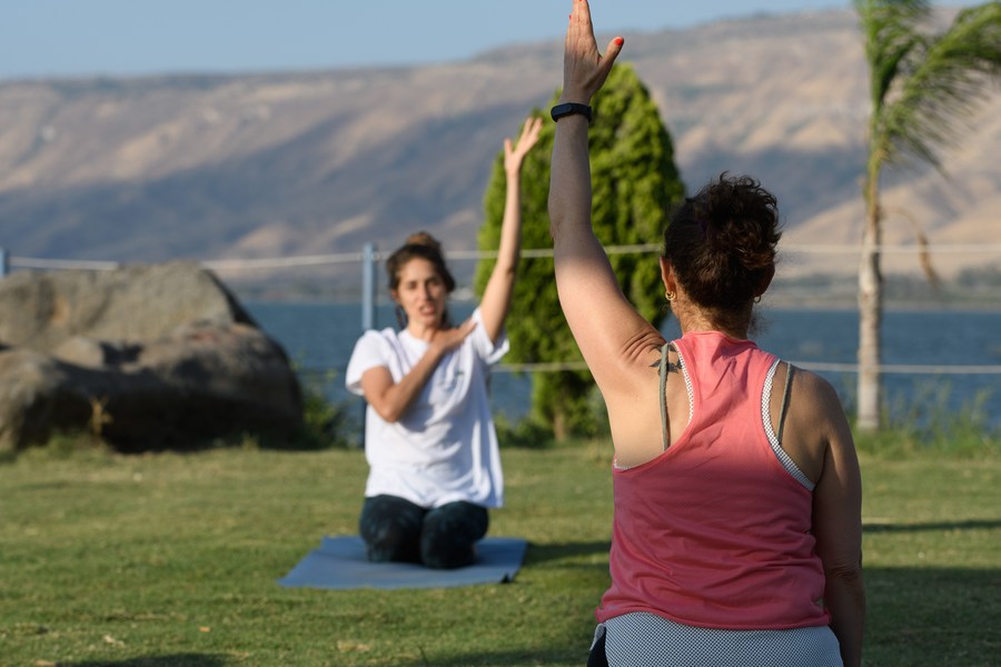 Israeli Yogis practice yoga on the International Day of Yoga next to the Sea of Galilee, Israel, on June 21, 2022. (Ayal Margolin/JINI via Xinhua)
