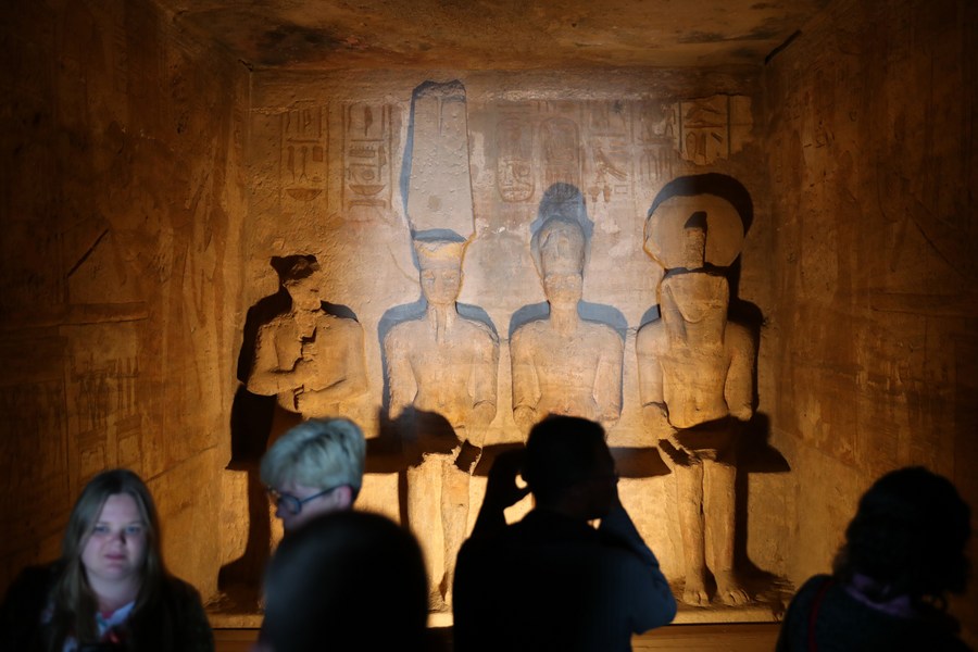 Tourists visit the Great Temple of Abu Simbel in Aswan, Egypt, Feb. 22, 2022. Abu Simbel temple complex are two massive rock-cut temples in southern Egyptian Aswan, consisting of the Great Temple of Ramses II and the Small Temple of Hathor and Nefertari. They were built in the 13th century BC, during which was the reign of ancient Egyptian 19th Dynasty's famous Pharaoh Ramses II. On Feb. 22 and Oct. 22, the rays of the sun would penetrate the sanctuary of the Great Temple of Ramses II and illuminate the sculptures on the back wall. (Xinhua/Sui Xiankai)