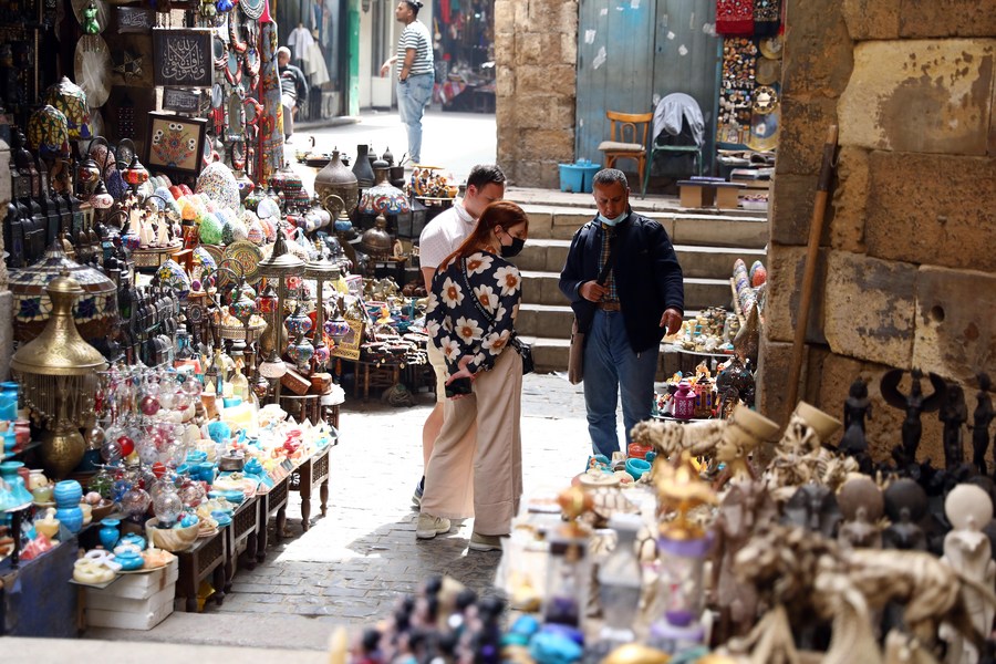 Tourists visit the Khan el-Khalili bazaar in Historic Cairo, Egypt, April 1, 2022. Egypt added on Friday 78 countries to its e-visa portal for tourists, expanding the list to cover more than 180 countries in a bid to attract more visitors, the Ministry of Tourism and Antiquities said in a statement. (Xinhua/Ahmed Gomaa)