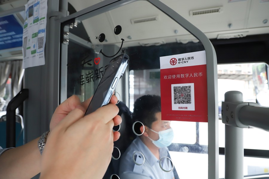 A passenger pays for a bus ticket in digital yuan (e-CNY) in southwest China's Chongqing, April 29, 2022. (Photo by Luo Ling/Xinhua)