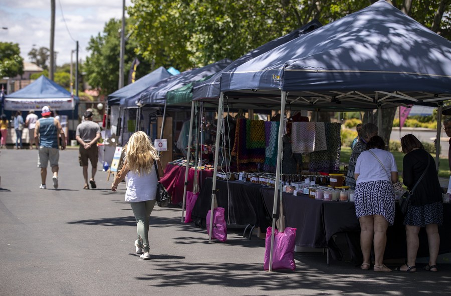 Tourists visit a market in Young, New South Wales, Australia, on Dec. 5, 2021. (Xinhua/Bai Xuefei)