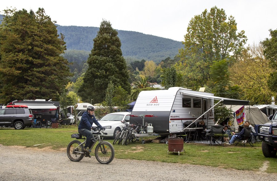 A man rides a bicycle in a camp park in Warburton, a rural area near Melbourne, Australia, on April 15, 2022. (Xinhua/Bai Xuefei)