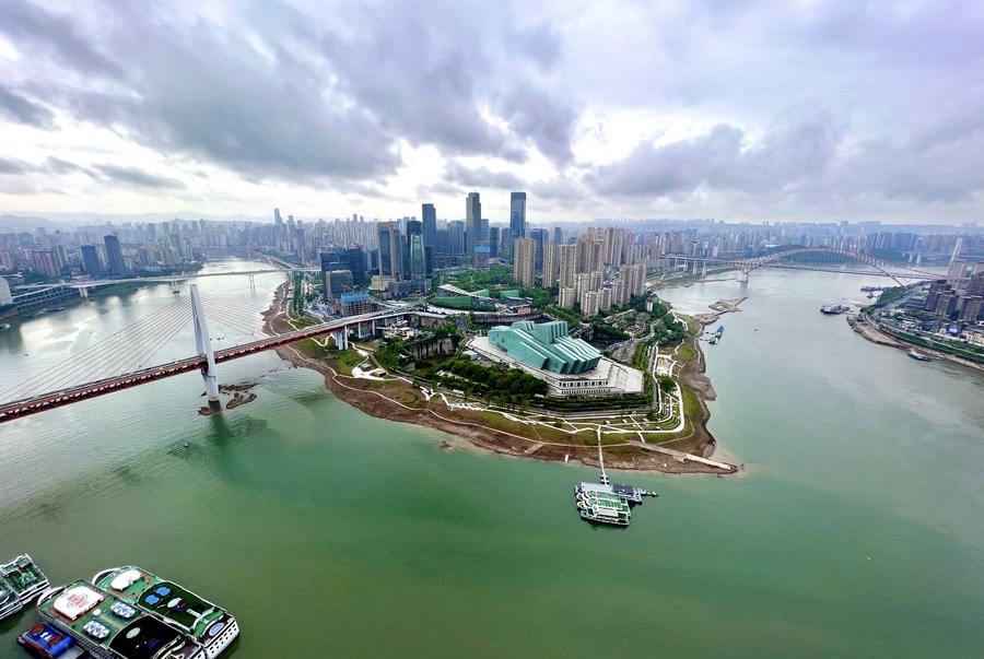 Photo taken with a mobile phone on April 12, 2022 shows a view at the confluence of the Yangtze River and the Jialing River in southwest China's Chongqing Municipality. (Xinhua/Hao Yuan)