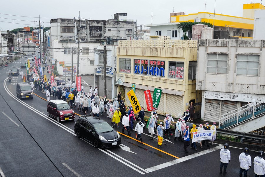 People take part in a protest in Okinawa, Japan, on May 14, 2022, asking to reduce the U.S. base-hosting burdens of the southernmost prefecture of Okinawa. (Xinhua/Zhang Xiaoyu)