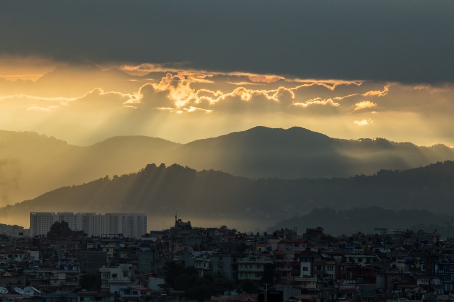 LALITPUR, Nepal, June 24 (Xinhua) -- In Nepal's Lalitpur, a sunrise is seen in the monsoon rain. The hazy light reflected in the clouds sprinkled on the mountains, which looks like a painting from the distance.