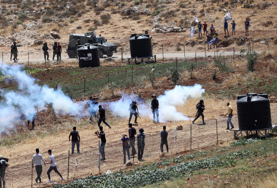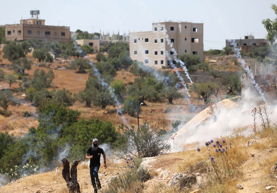 An Israeli soldier throws a tear gas canister at Palestinian protesters during clashes following a protest against the expansion of Jewish settlements in the West Bank village of Beit Dajan, east of Nablus, June 24, 2022. (Photo by Nidal Eshtayeh/Xinhua)
