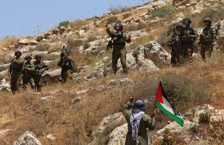 Palestinian protesters clash with Israeli soldiers and members of Israeli border police following a protest against the expansion of Jewish settlements in the West Bank village of Qaryut, south of Nablus, on June 24, 2022. (Photo by Ayman Nobani/Xinhua)