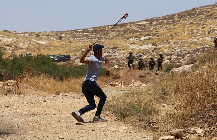 A Palestinian protester uses a slingshot to hurl a stone at Israeli soldiers during clashes following a protest against the expansion of Jewish settlements in the West Bank village of Beit Dajan, east of Nablus, June 24, 2022. (Photo by Nidal Eshtayeh/Xinhua)■
