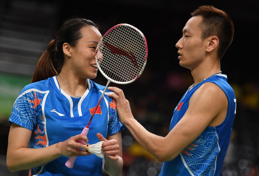 China's Zhang Nan and Zhao Yunlei (L) compete during the mixed badminton doubles semifinal against Indonesia's Ahmad Tontowi and Natsir Liliyana at the 2016 Rio Olympic Games in Rio de Janeiro, Brazil on Aug. 15, 2016.(Xinhua/Han Yuqing)