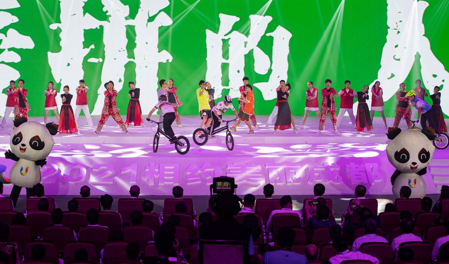 Organizers hold a promotion activity for the Summer University Games in Chengdu, capital of southwest China's Sichuan Province on Aug. 18, 2020. (Xinhua/Jiang Hongjing)