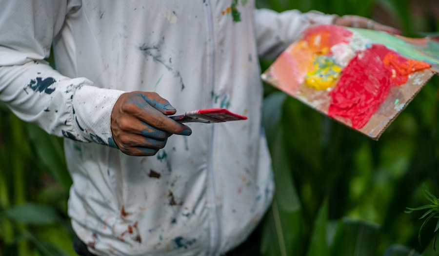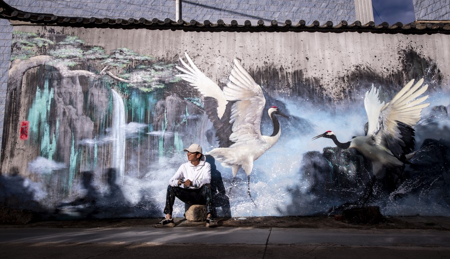 Liu Zhicheng takes a break with his wall painting in the background in Yongsheng County, Lijiang City, southwest China's Yunnan Province, June 24, 2022. (Xinhua/Jiang Wenyao)