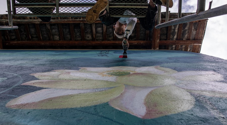 Liu Zhicheng works on a wall painting in Yongsheng County, Lijiang City, southwest China's Yunnan Province, June 24, 2022. (Xinhua/Jiang Wenyao)