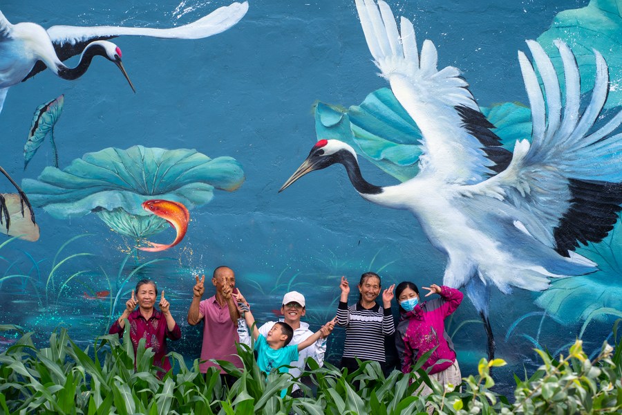 Liu Zhicheng (C) poses for a photo with villagers after finishing a wall painting in Yongsheng County, Lijiang City, southwest China's Yunnan Province, June 24, 2022. (Xinhua/Jiang Wenyao)■