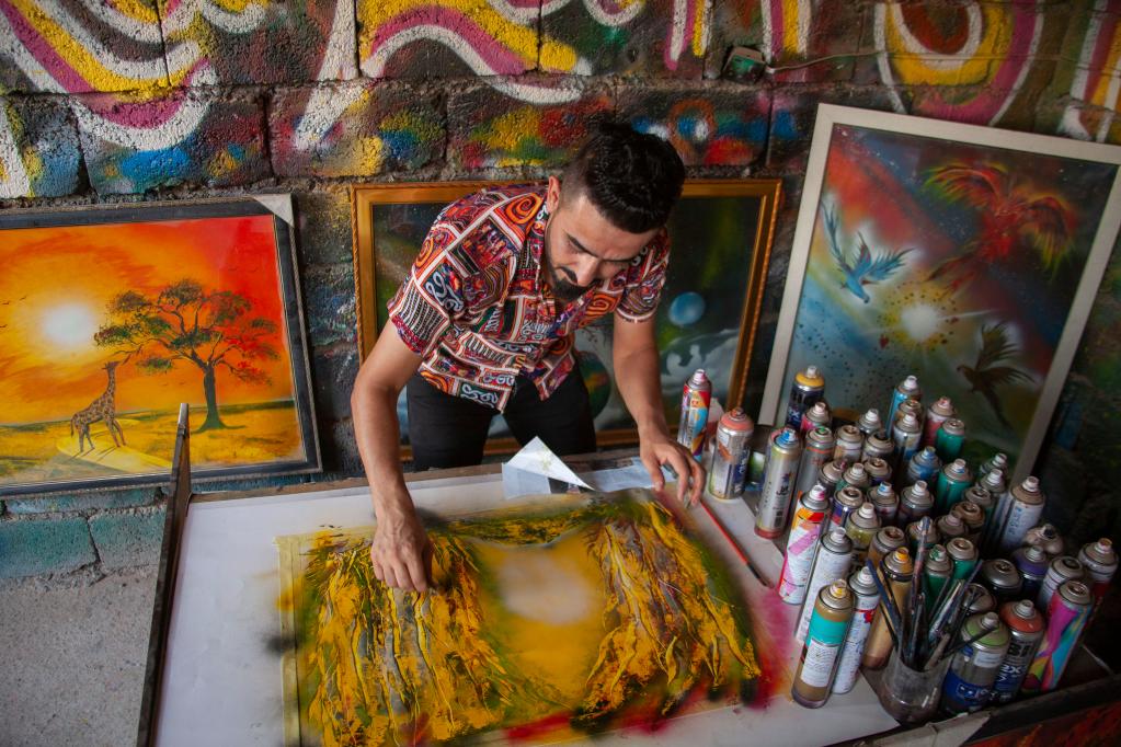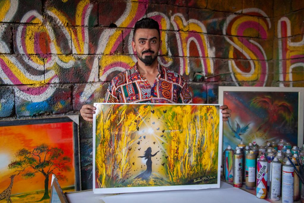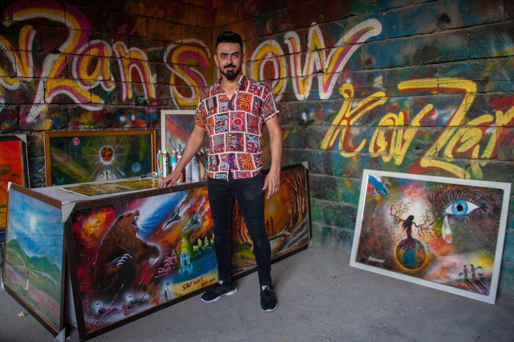 Karzan Omar Qader, an Iraqi artist, shows his paints in Erbil, Iraq, on June 28, 2022. (Xinhua/Dalshad Al-Daloo)