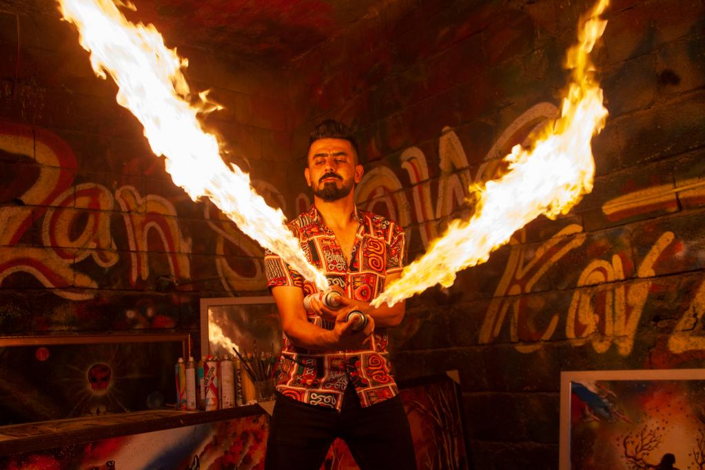 Karzan Omar Qader, an Iraqi artist, paints with fire and spray in Erbil, Iraq, on June 28, 2022. (Xinhua/Dalshad Al-Daloo)