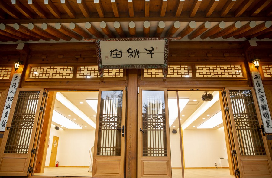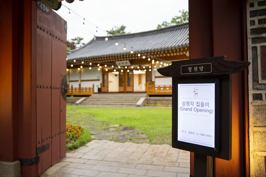 Photo taken on June 27, 2022 shows an opening sign by the door of a hanok of Samcheonggak in Seoul, South Korea. (Xinhua/Wang Yiliang)