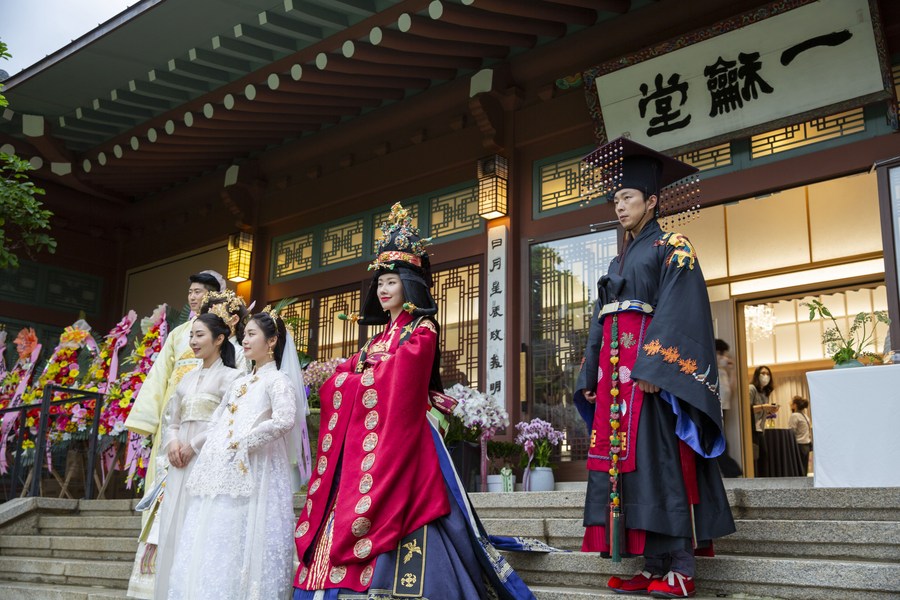 Traditional performance is staged during the reopening ceremony of Samcheonggak in Seoul, South Korea, June 27, 2022. (Xinhua/Wang Yiliang)