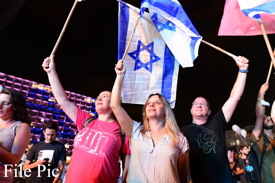 People celebrate after Israel's parliament approved a new coalition government on Rabin Square in Tel Aviv, on June 13, 2021. (File photo)