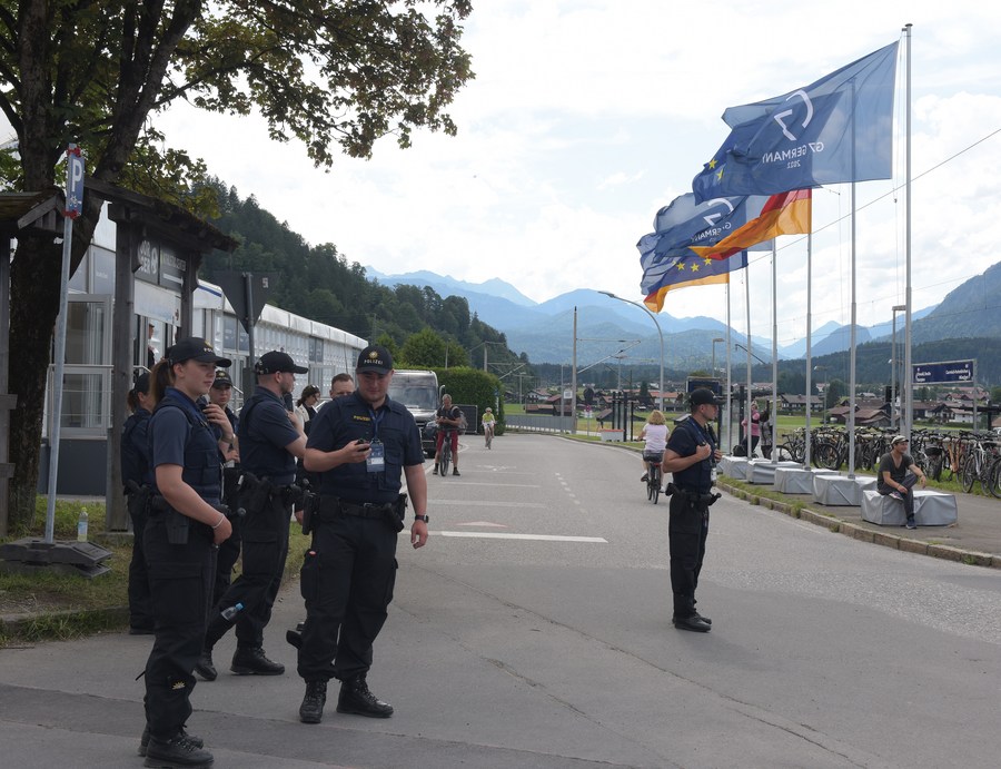 Police patrol outside the international media centre during the Group of Seven (G7) summit in Garmisch-Partenkirchen, Germany, June 26, 2022. (Xinhua/Guo Chen)■