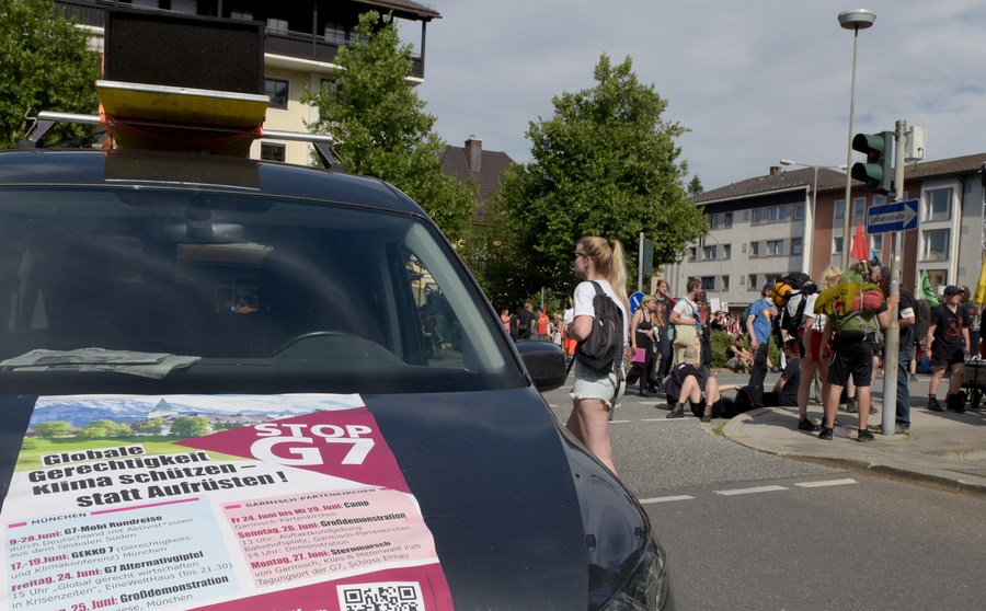 People take part in a protest in Garmisch-Partenkirchen, Germany, June 26, 2022. (Xinhua/Guo Chen)
