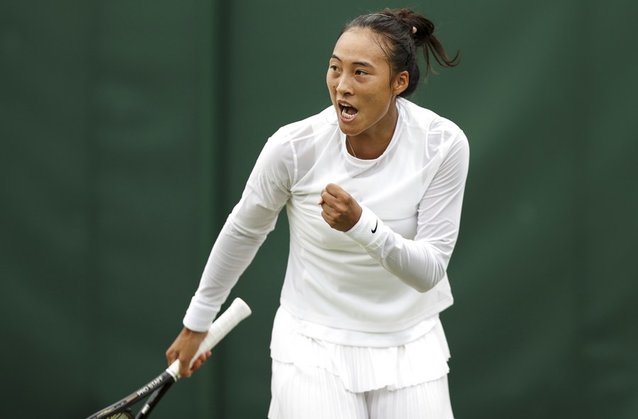 Zheng Qinwen of China celebrates scoring during the women's singles second-round match against Greet Minnen of Belgium at the Wimbledon Tennis Championship in London, Britain, June 30, 2022. (Xinhua/Han Yan)