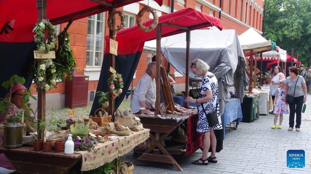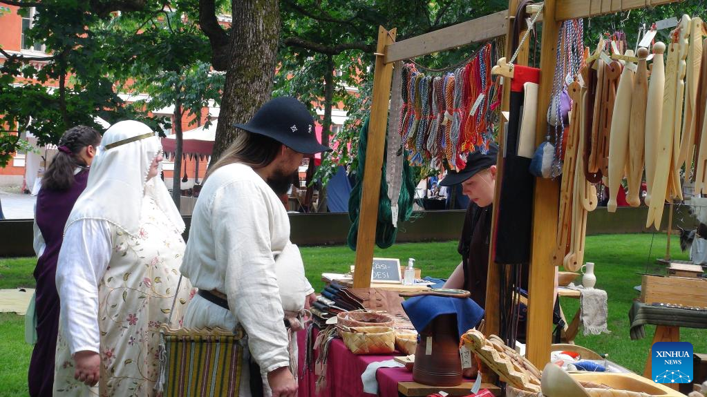 Tourists visit a stall at the annual Medieval Market in Turku, Finland, June 30, 2022. The annual Medieval Market, one of the largest historical events in Finland, kicked off on Thursday. Visitors enjoy a robust medieval atmosphere with stall owners and actors dressed in medieval style costumes at the market. (Xinhua/Chen Jing)