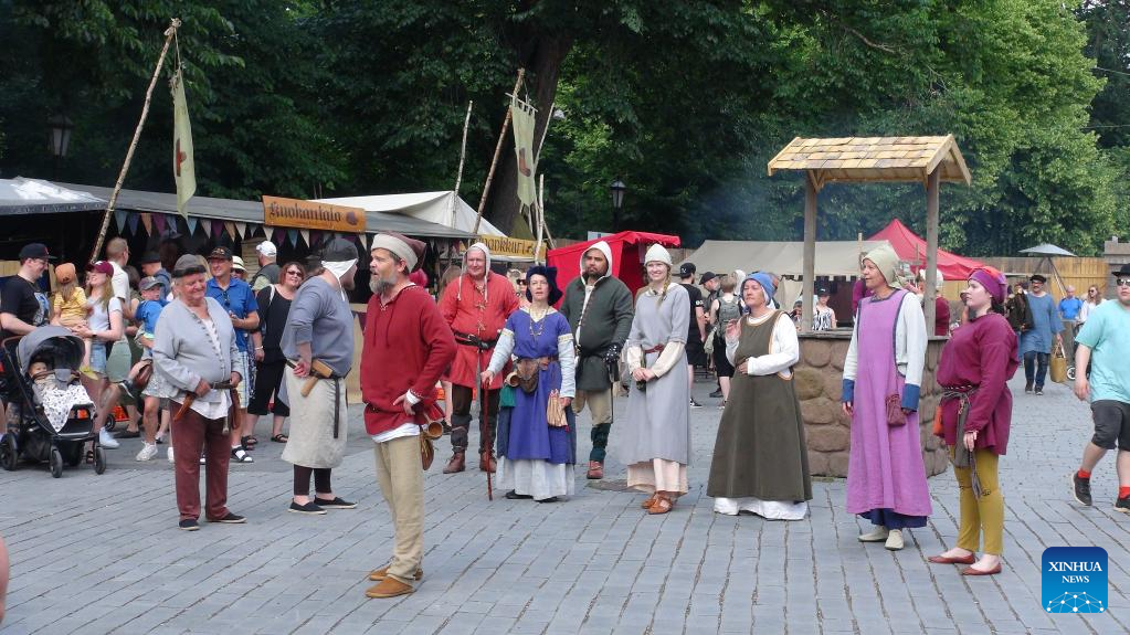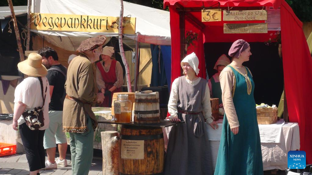 Stall owners dressed in medieval style costumes are seen at the annual Medieval Market in Turku, Finland, June 30, 2022. The annual Medieval Market, one of the largest historical events in Finland, kicked off on Thursday. Visitors enjoy a robust medieval atmosphere with stall owners and actors dressed in medieval style costumes at the market. (Xinhua/Chen Jing)