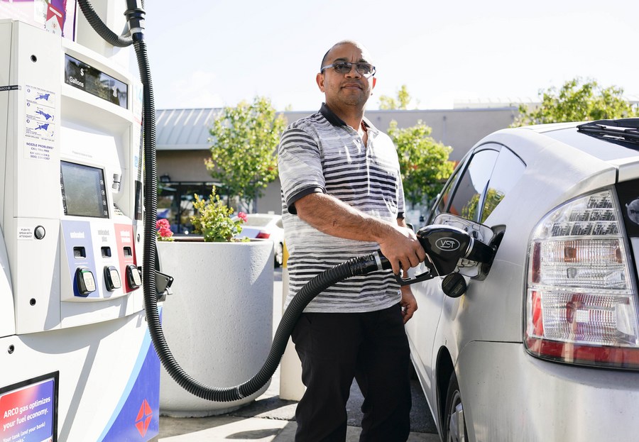 A man pumps gasoline into his car at a gas station in Millbrae, California, the United States, May 10, 2022. (Photo by Li Jianguo/Xinhua)