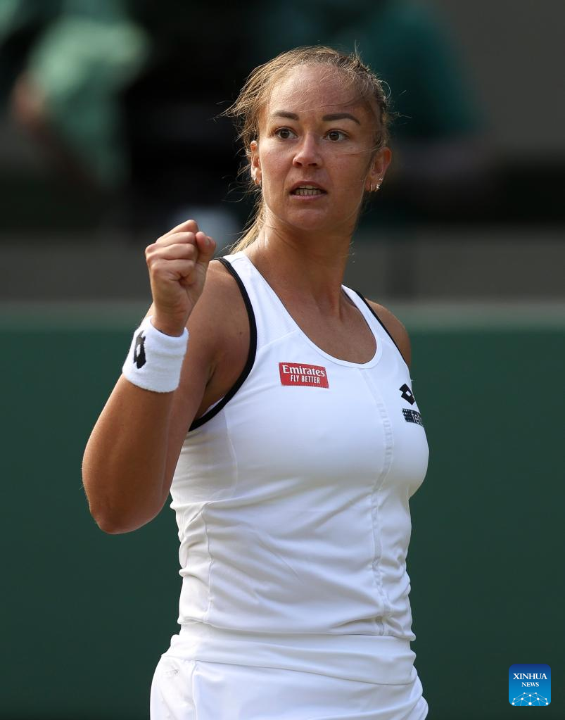 Lesley Pattinama Kerkhove celebrates scoring during the women's singles second round match between Iga Swiatek of Poland and Lesley Pattinama Kerkhove of the Netherlands at Wimbledon Tennis Championship in London, Britain, on June 30, 2022. (Xinhua/Han Yan)