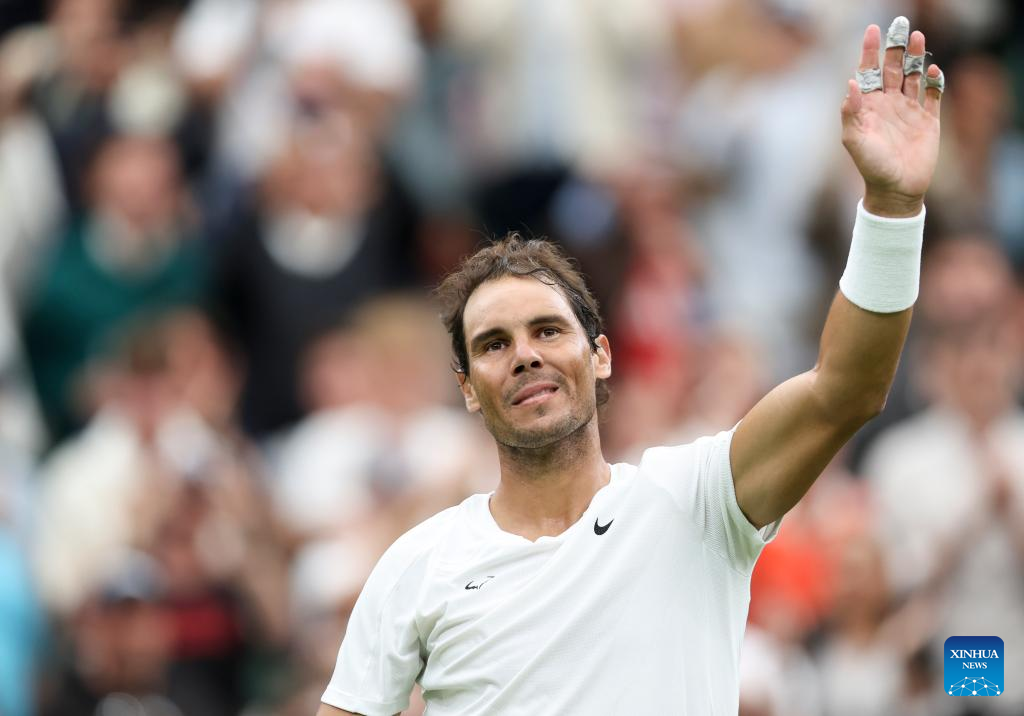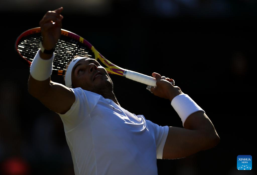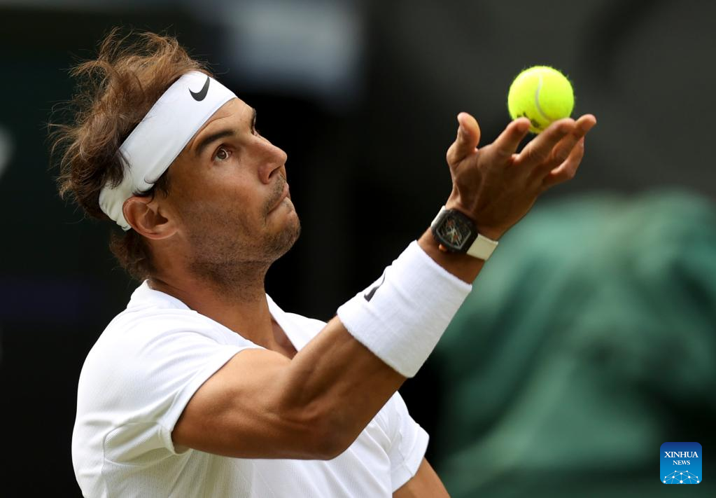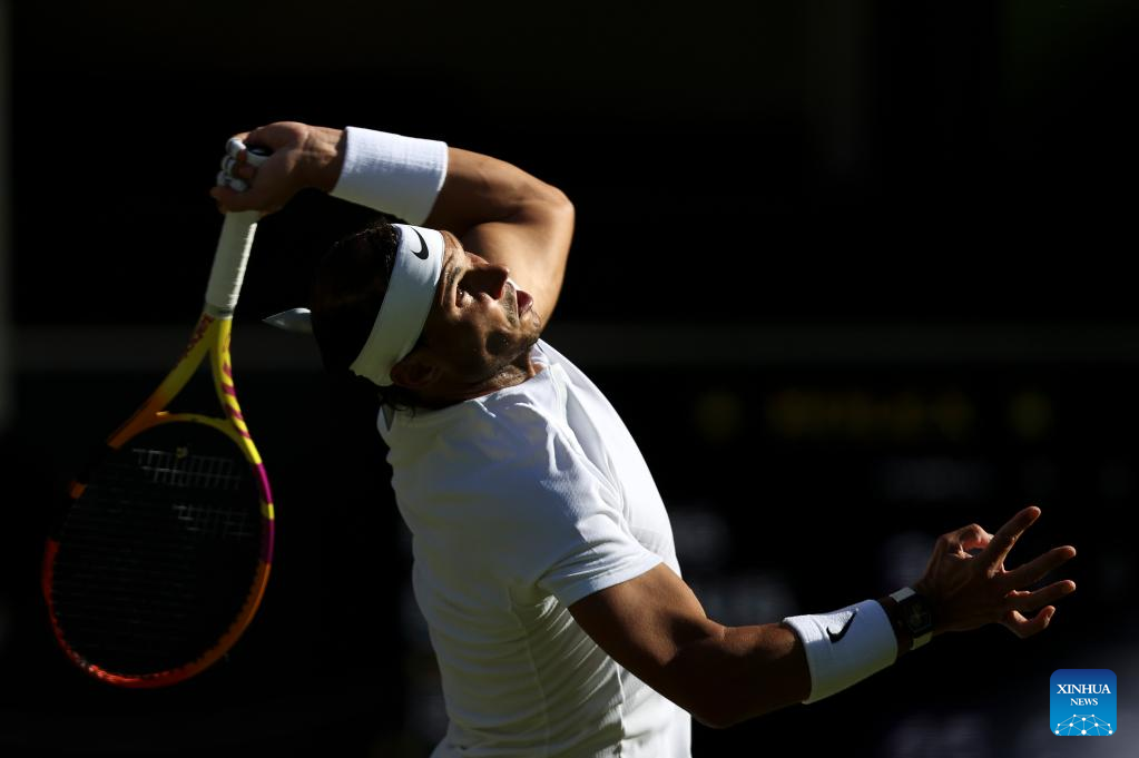 Rafael Nadal competes during the men's singles second round match between Rafael Nadal of Spain and Ricardas Berankis of Lithuania at Wimbledon Tennis Championship in London, Britain, on June 30, 2022. (Xinhua/Han Yan)