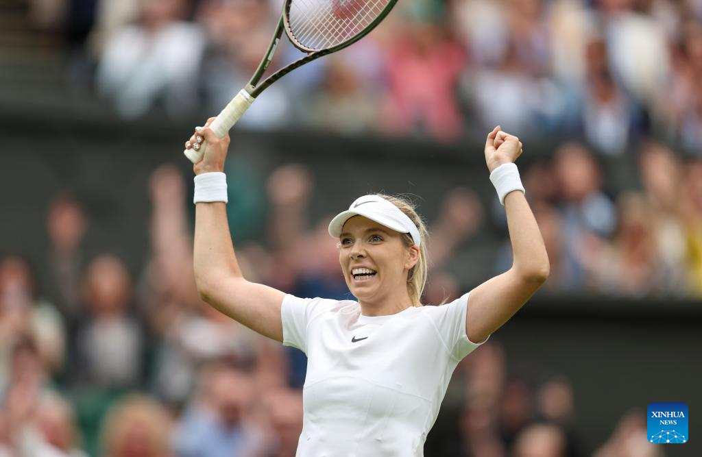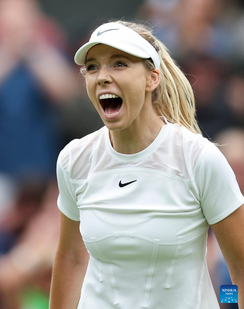Katie Boulter celebrates after winning the women's singles second round match between Katie Boulter of Britain and Karolina Pliskova of the Czech Republic at Wimbledon Tennis Championship in London, Britain, on June 30, 2022. (Xinhua/Han Yan)