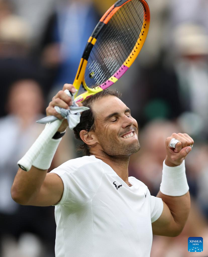 Rafael Nadal celebrates after winning the men's singles second round match between Rafael Nadal of Spain and Ricardas Berankis of Lithuania at Wimbledon Tennis Championship in London, Britain, on June 30, 2022. (Xinhua/Han Yan)