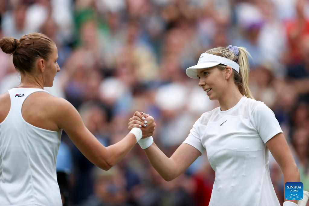 Katie Boulter (R) greets with Karolina Pliskova after the women's singles second round match between Katie Boulter of Britain and Karolina Pliskova of the Czech Republic at Wimbledon Tennis Championship in London, Britain, on June 30, 2022. (Xinhua/Han Yan)