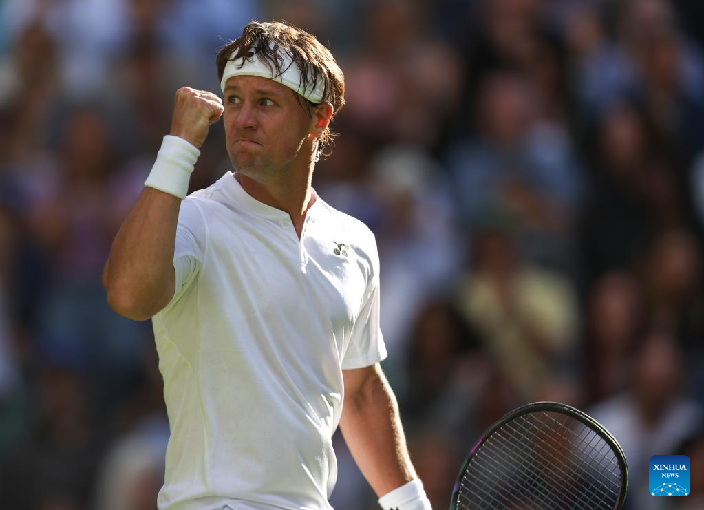 Ricardas Berankis celebrates scoring during the men's singles second round match between Rafael Nadal of Spain and Ricardas Berankis of Lithuania at Wimbledon Tennis Championship in London, Britain, on June 30, 2022. (Xinhua/Han Yan)