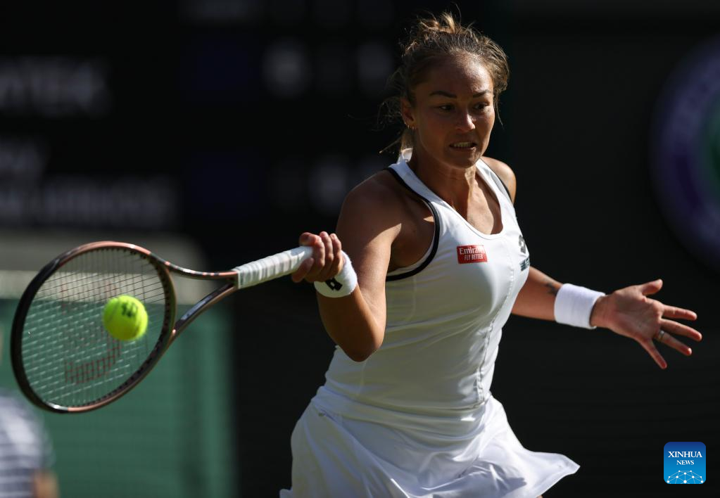 Katie Boulter competes during the women's singles second round match between Katie Boulter of Britain and Karolina Pliskova of the Czech Republic at Wimbledon Tennis Championship in London, Britain, on June 30, 2022. (Xinhua/Han Yan)