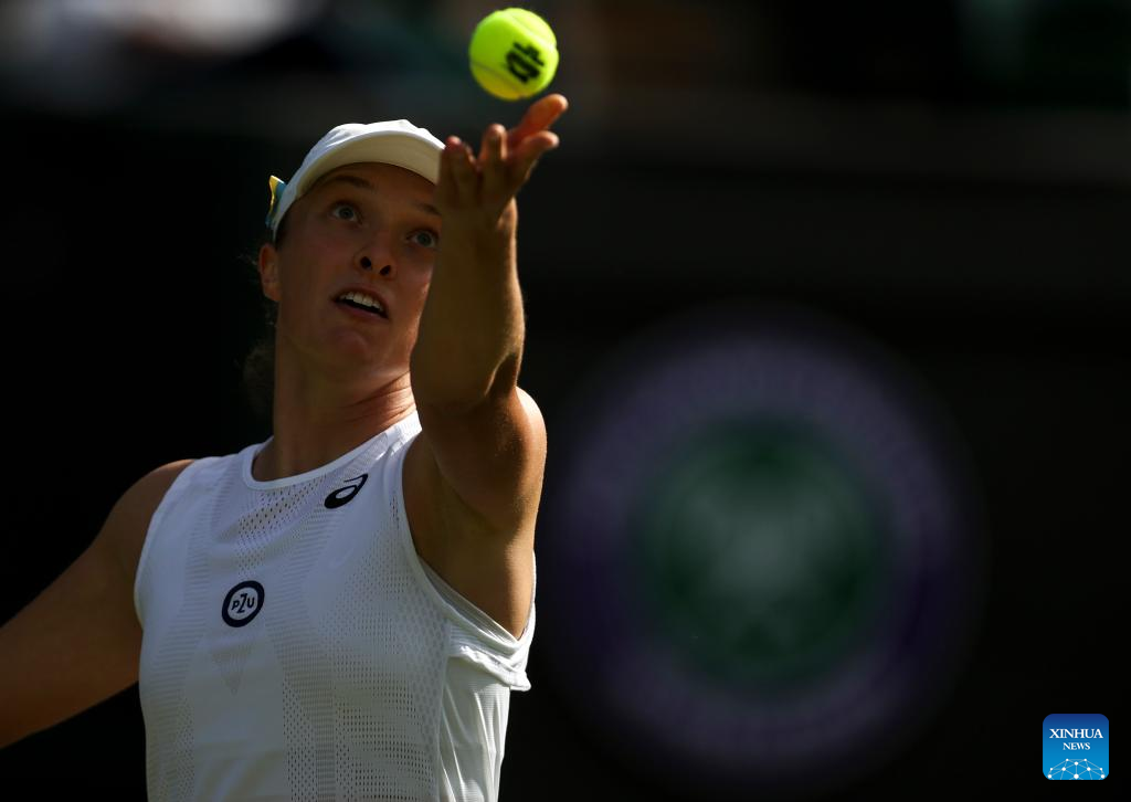 Iga Swiatek serves during the women's singles second round match between Iga Swiatek of Poland and Lesley Pattinama Kerkhove of the Netherlands at Wimbledon Tennis Championship in London, Britain, on June 30, 2022. (Xinhua/Han Yan)